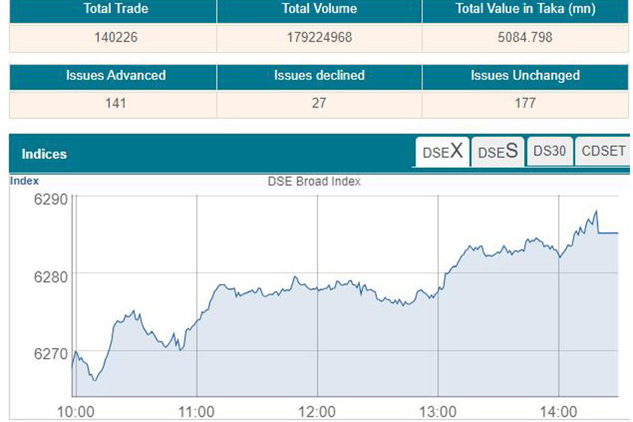 DSEX, the prime index of the Dhaka Stock Exchange (DSE), went up by 17.43 points or 0.28 per cent to settle at 6,285.25.