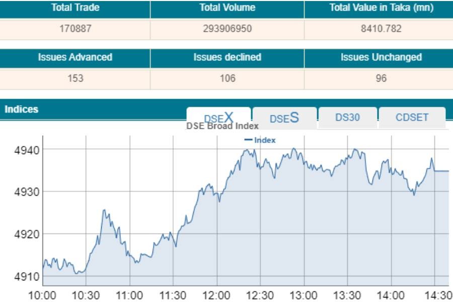 DSEX, the key index of the Dhaka Stock Exchange (DSE), went up by 30.90 points or 0.63 per cent to settle at 4,934. DSEX added more than 68 points in the past two trading sessions.