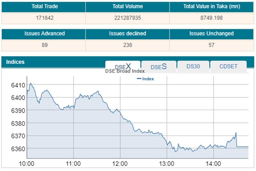 DSEX, the prime index of the Dhaka Stock Exchange (DSE), went down by 30.60 points or 0.47 per cent to settle at 6,361. DSEX eroded nearly 123 points in the past four days.