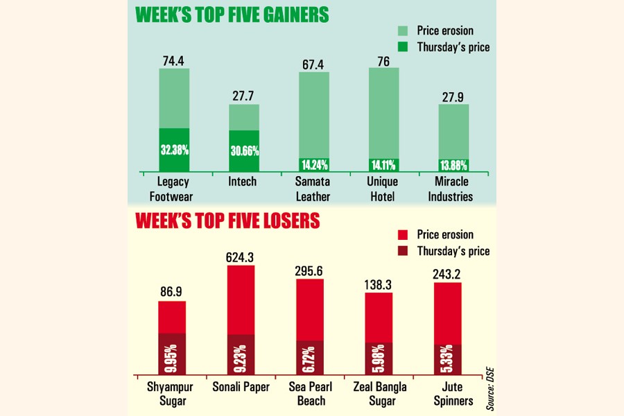 Legacy Footwear was the week's top gainer for the two consecutive weeks, soaring 32.38 per cent further while Shyampur Sugar Mills was the worst loser, shedding 9.95 per cent.