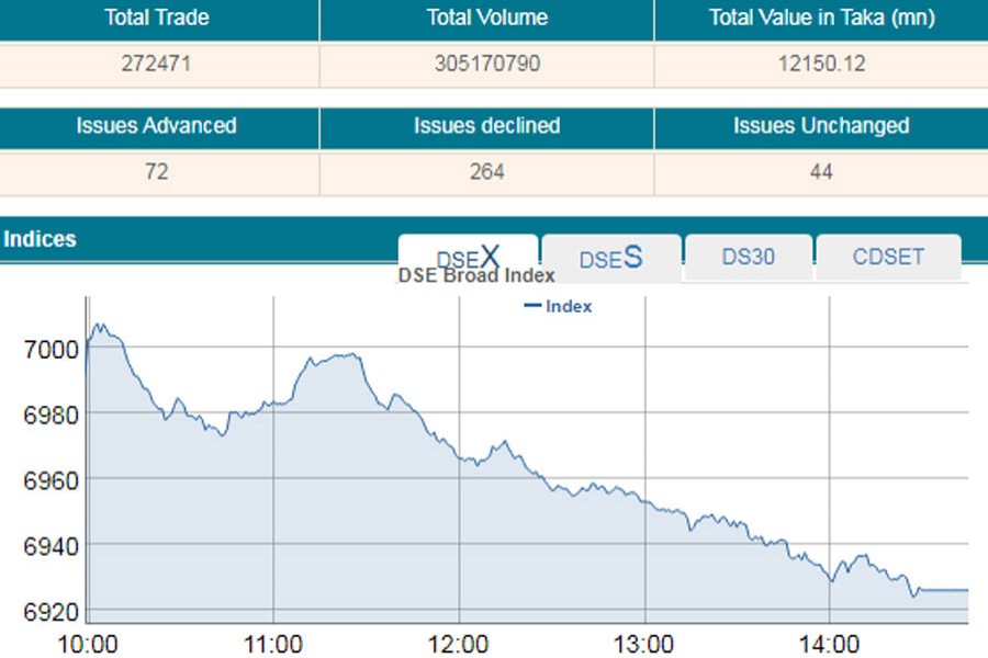 DSEX, the prime index of the Dhaka Stock Exchange (DSE), slid 65.26 points or 0.93 per cent to settle at 6,926, the lowest in three weeks since January 4, when the DSEX was 6,892.