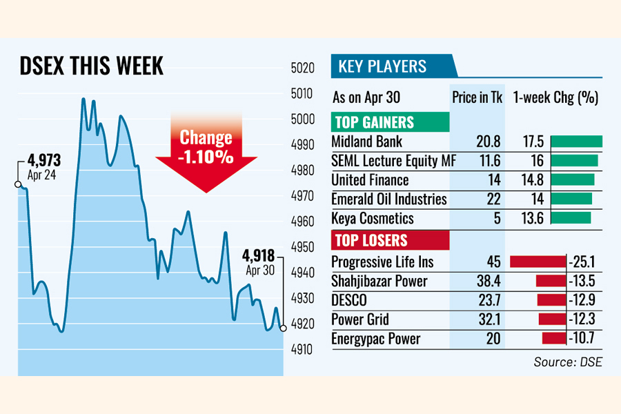 DSEX, the benchmark index of the Dhaka Stock Exchange (DSE), finally slid 55 points or 1.10 per cent this week to settle at 4,918, the lowest in more than six months.