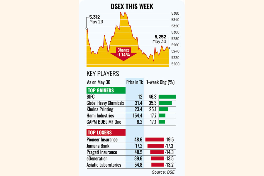 Finally, the benchmark DSEX index of Dhaka Stock Exchange (DSE) settled the week more than 60 points or 1.14 per cent lower at 5,252.
