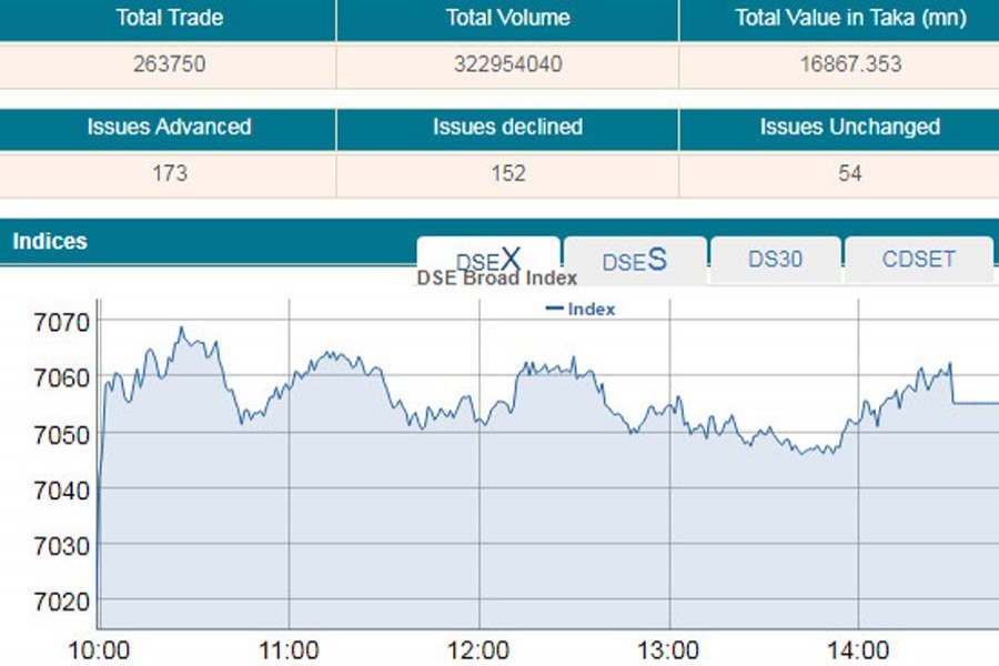 DSEX, the prime index of the Dhaka Stock Exchange (DSE), went up by 35.67 points to settle at 7,055.