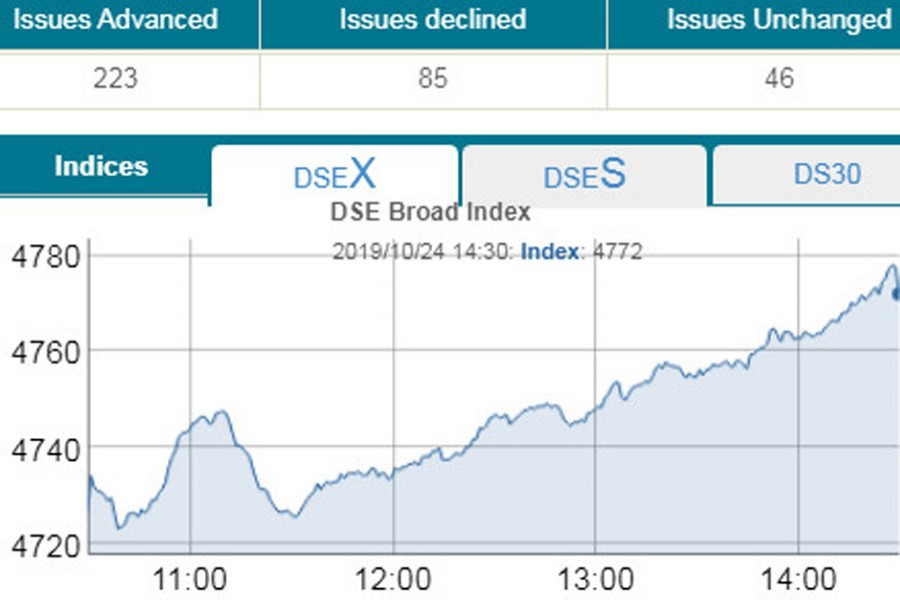DSEX, the prime index of the Dhaka Stock Exchange (DSE), went up by 45.38 points or 0.96 per cent to settle at 4,772.