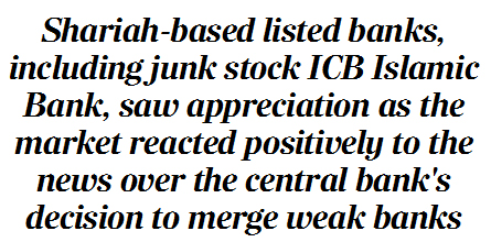 On the other hand, Shariah-based listed banks, including junk stock ICB Islamic Bank, saw appreciation as the market reacted positively to the news over the central bank's decision to merge weak banks in the drive to reform the financial sector.