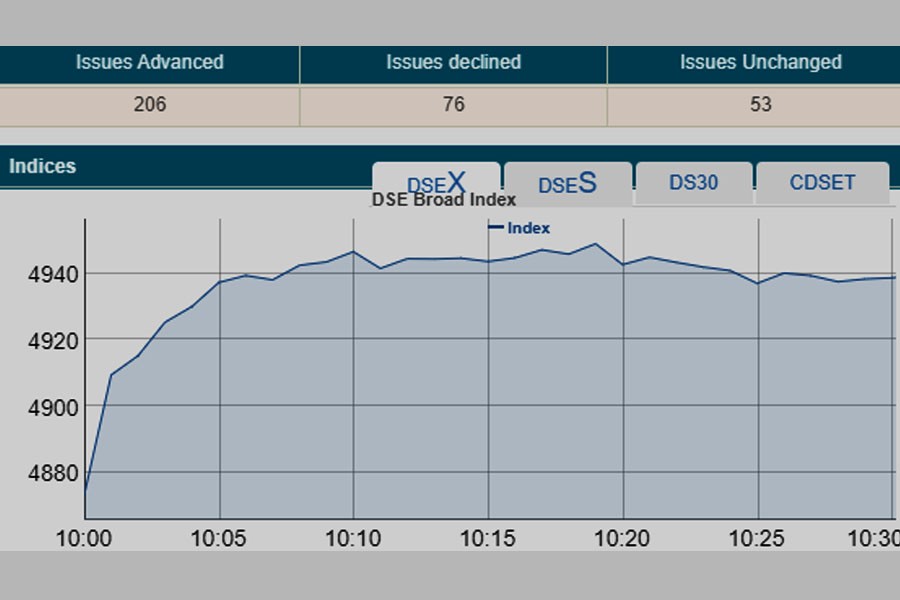DSEX, the prime index of the DSE, went up by 65.63 points or 1.34 per cent to reach 4,938 points at 10:30am.