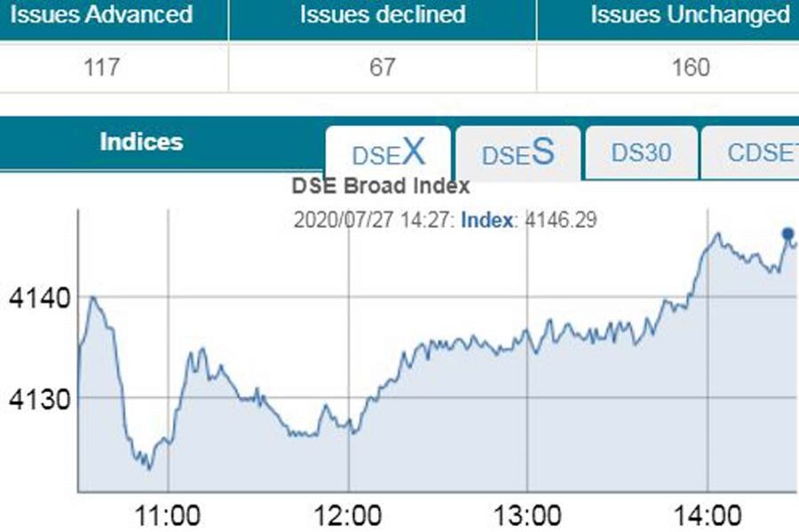 DSEX, the key index of the Dhaka Stock Exchange (DSE), went up by 16.30 points or 0.39 per cent to settle at 4,145 during the four hours trading.