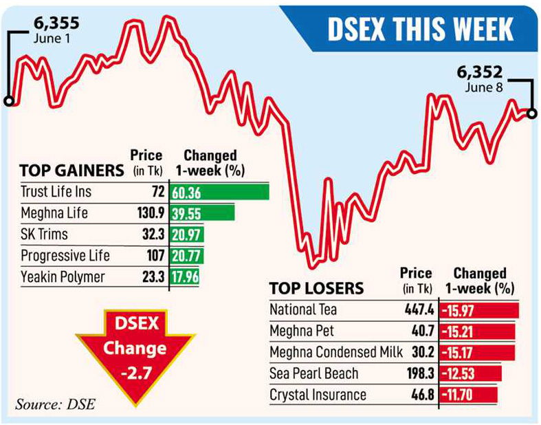 DSEX, the benchmark index of the Dhaka Stock Exchange (DSE), finally went down by 2.72 points to settle the week at 6,352.84, after gaining 93 points in the past four weeks.