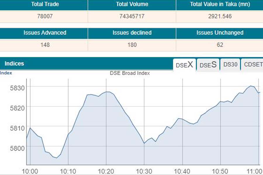 Following the news, the prime index of the Dhaka Stock Exchange (DSE), went up by 26 points or 0.45 per cent to 5,829 within the first hour of trading at 11:00 am, when the report was filed.