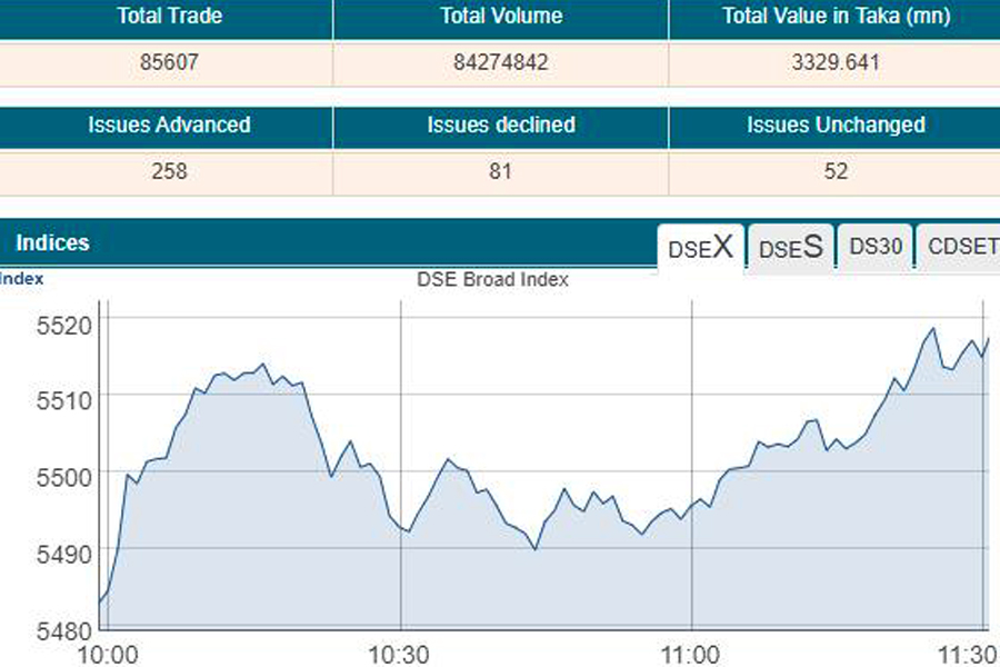 After the first one and a half hours of trading, DSEX, the prime index of the Dhaka Stock Exchange (DSE), went up by more than 30 points or 0.55 per cent to 5,513 at 11:30 am, when the report was filed.