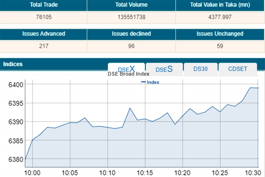 Of the issues traded till then, 230 advanced, 81 declined and 48 remained unchanged on the DSE trading floor till then.
