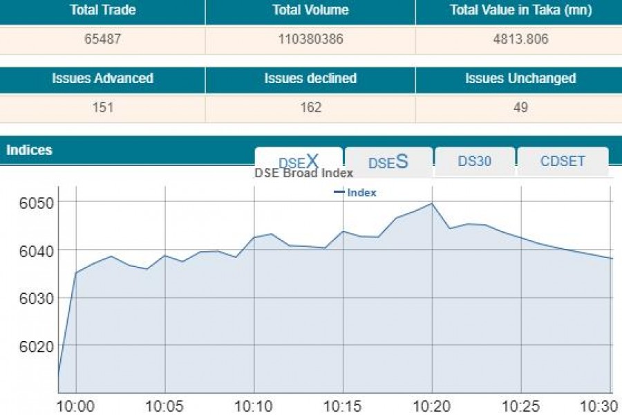 Following the previous two days’ marginal correction, the market opened higher and DSEX, the prime index of the DSE, went up by 25.45 points or 0.42 per cent to reach at 6,039 within the first 30 minutes of trading when the report was filed at 10:30 am.