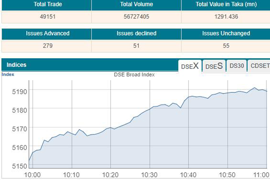 Accordingly, the prime index of the Dhaka Stock Exchange (DSE) went up by 33 points or 0.65 per cent to 5,185 at 11:00 am, when the report was filed.