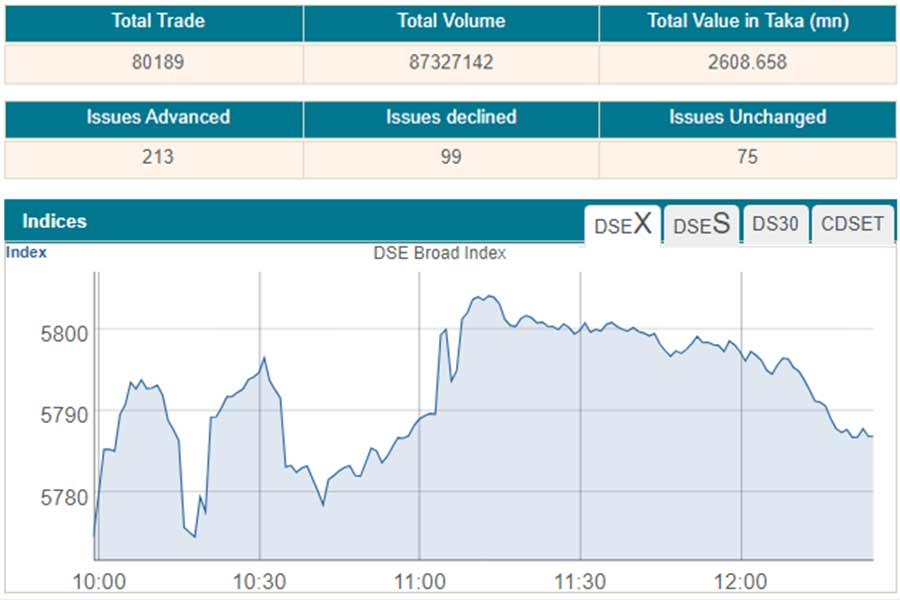 After the first two hours of trading, the key index of the Dhaka Stock Exchange went up by 21 points or 0.36 per cent to 5,795 at 12:00 noon, when the report was filed.