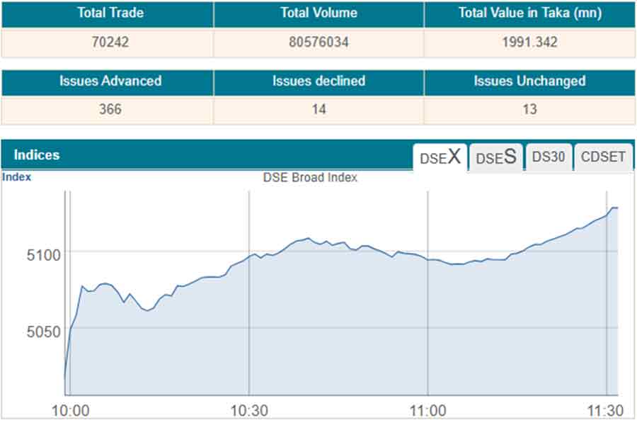 Following the previous day's big recovery, the prime index of the Dhaka Stock Exchange (DSE), went up by 78 points or 1.55 per cent to 5,095 at 11:00 am, when the report was filed.