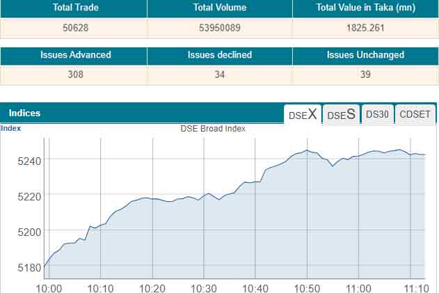 Following the previous day’s sharp gain, the prime index of the Dhaka Stock Exchange (DSE) went up by 62 points, or 1.18 per cent, to 5,240 at 11:00 am, when the report was filed.