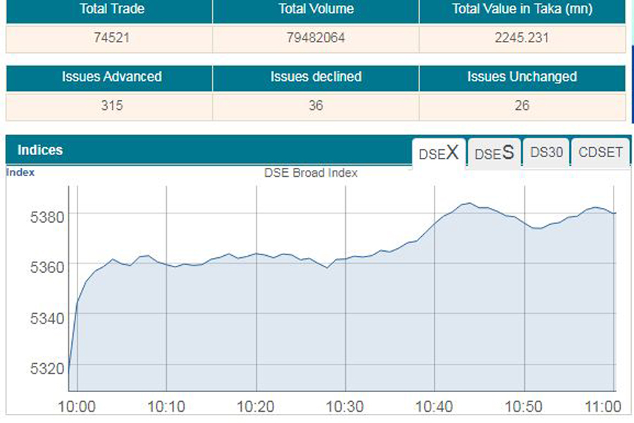 Following the previous day’s gain, the prime index of the Dhaka Stock Exchange (DSE), went up by 65 points or 1.22 per cent to 5,380 at 11:00 am, when the report was filed.