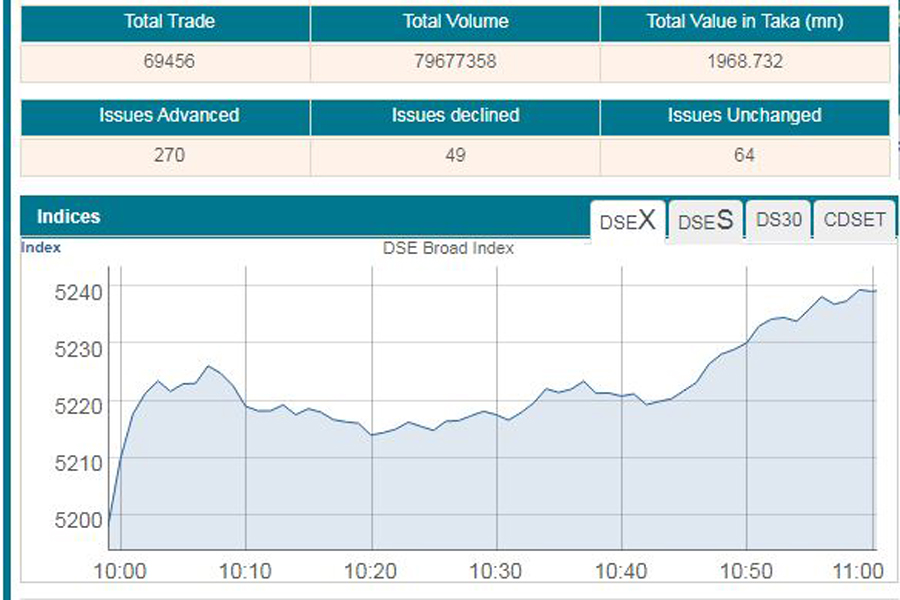 Following the previous day’s rise, the prime index of the Dhaka Stock Exchange (DSE), went up by 41 points or 0.80 per cent to 5,239 at 11:00 am, when the report was filed.