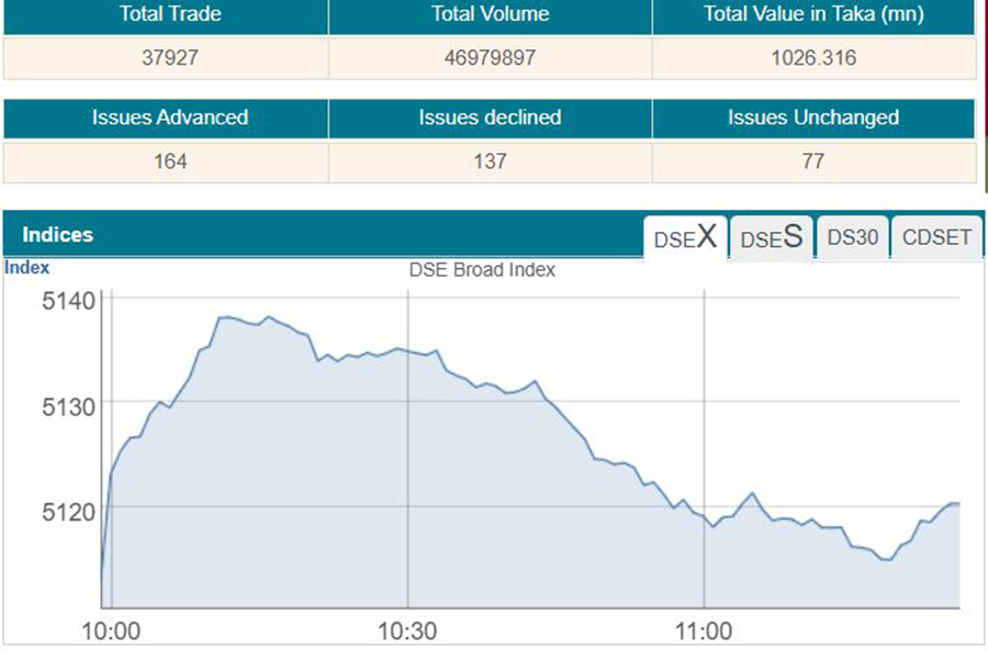 Following the previous day’s flat ending, the prime index of the Dhaka Stock Exchange (DSE), went up by 9 points or 0.16 per cent to 5,121 at 11:00 am, when the report was filed.