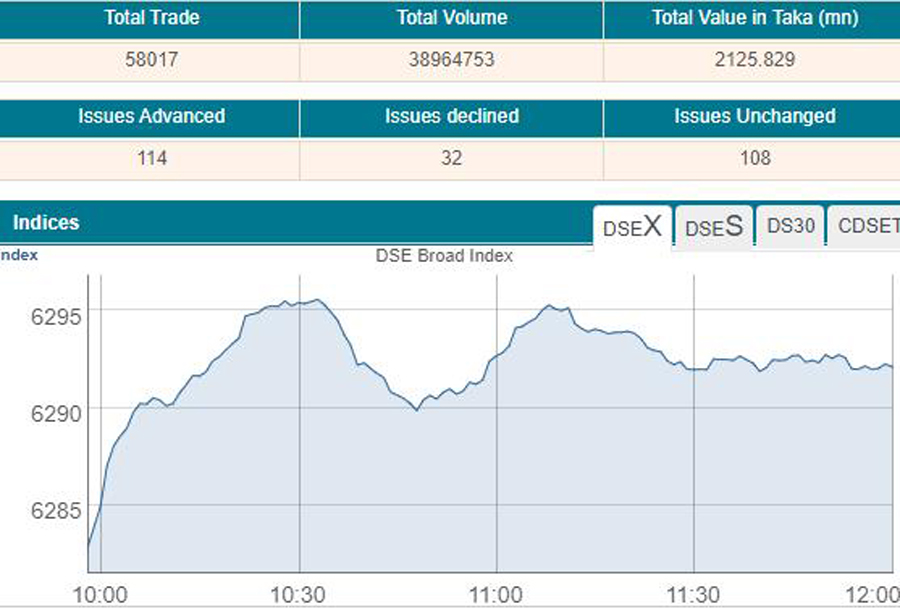 Following the previous day’s flat ending, DSEX, the prime index of the Dhaka Stock Exchange (DSE), went up by 9.22 points to 6,292 after the first two hours of trading at 12:00 noon.