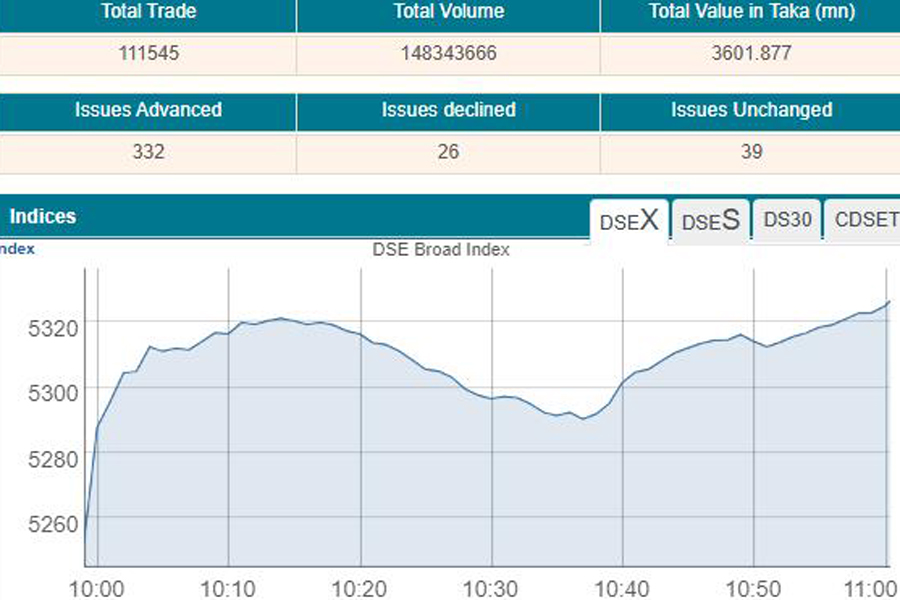 Of the issues traded till then, 345 advanced, 14 declined, and 32 issues remained unchanged on the DSE trading floor.