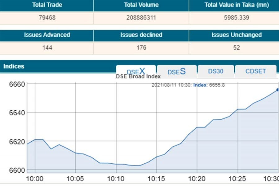 DSEX, the prime index of the Dhaka Stock Exchange (DSE), went up by 34.38 points or 0.51 per cent to stand at 6,652 points within the first 30 minutes of trading at 10:30 am –the highest since its inception more than eight years back in 2013.