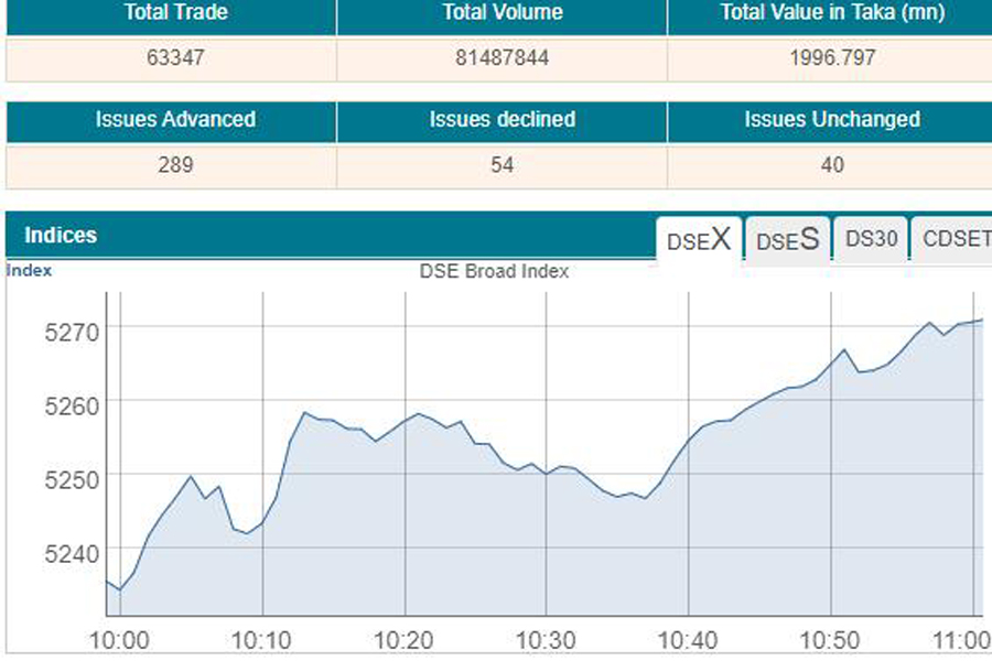 DSEX, the prime index of the Dhaka Stock Exchange, went up by more than 35 points or 0.66 per cent to 5270, after the first hour of trading.