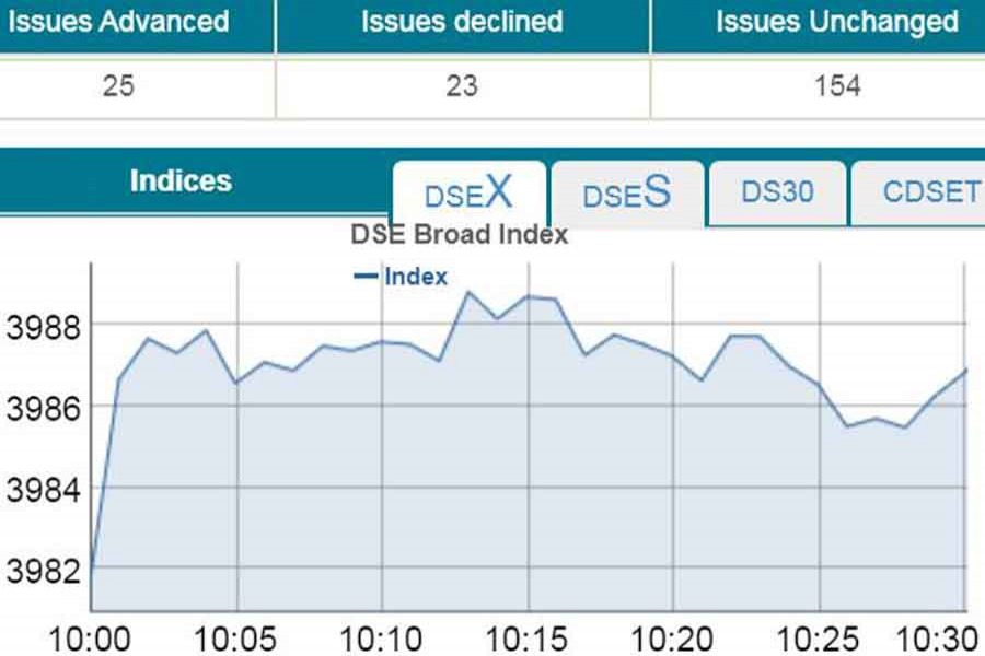 DSEX, the prime index of the DSE, went up by 5.35 points or 0.13 per cent to stand 3,986 points at 10:30 am.