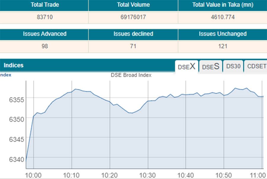 Following the previous day’s modest rise, the key index of the Dhaka Stock Exchange (DSE) went up by 16.54 points to stand at 6,355, after the first hour of trading at 11:00 am.
