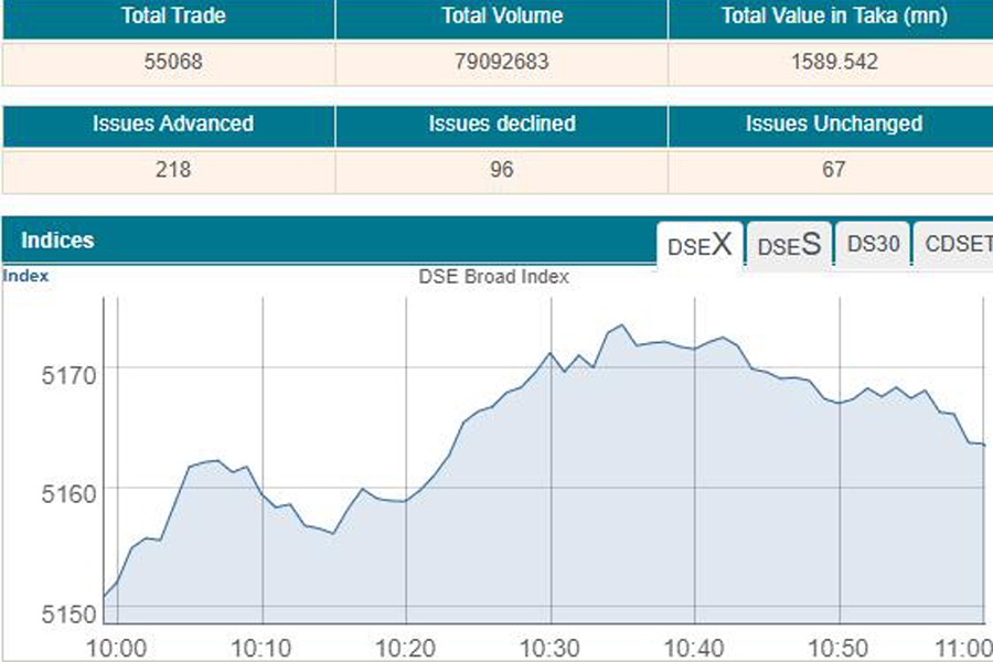 Following the previous three days’ downturn, the prime index of the Dhaka Stock Exchange (DSE) went up by 5 points or 0.09 per cent to 5,155 at 11:00 am, when the report was filed.