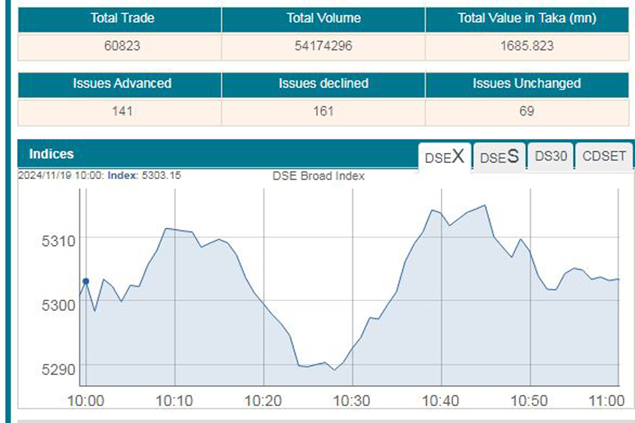 Following the previous day’s fall, the prime index of the Dhaka Stock Exchange (DSE), went up by 3 or 0.05 per cent to 5,303 at 11:00 am, when the report was filed.