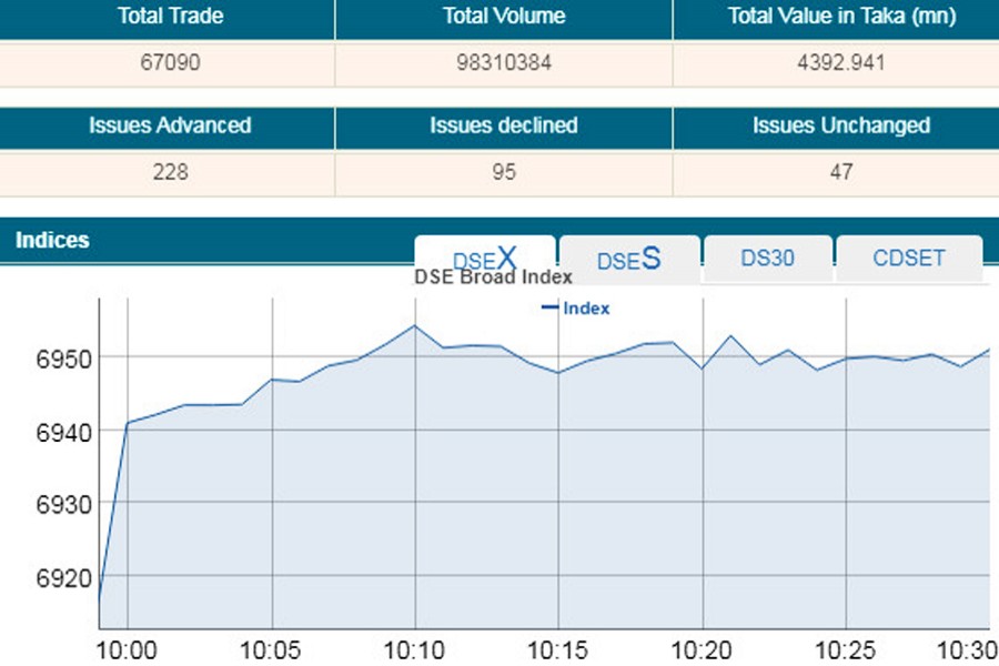 After crossing the 6,900-mark in the previous day, DSEX, the prime index of the Dhaka Stock Exchange (DSE), went up by 32.42 points to stand at 6,948 within the first 30 minutes of trading at 10:30 am –the highest since its inception on January 27, 2013.