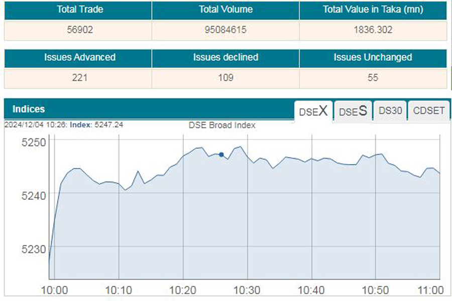 Of the issues traded till then, 223 advanced, 96 declined, and 62 issues remained unchanged on the DSE trading floor till then.