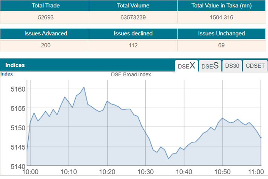 Following the previous four days’ downturn, the prime index of the Dhaka Stock Exchange (DSE), went up by 6 points or 0.12 per cent to 5,148 at 11:00 am, when the report was filed.