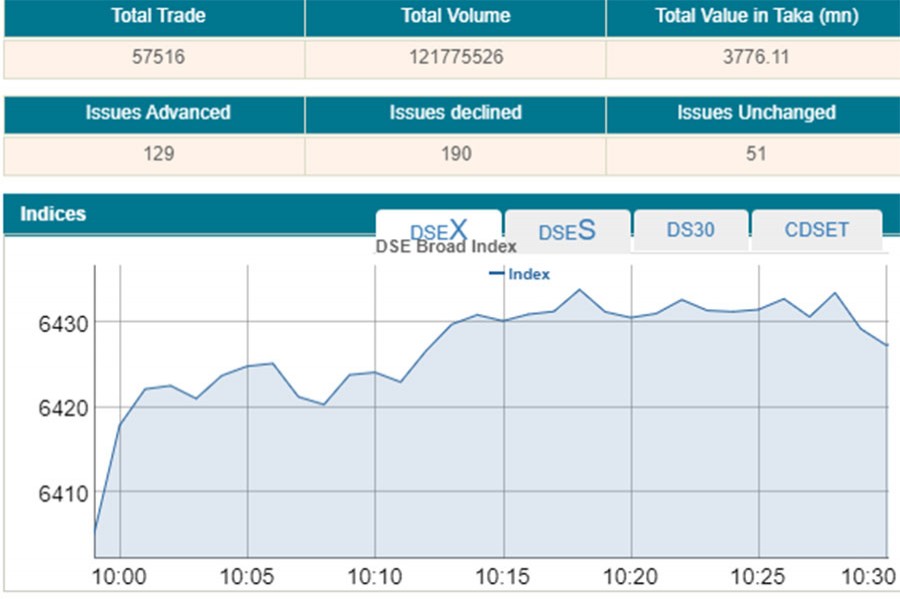 The port city bourse – the Chittagong Stock Exchange – (CSE) also saw an upbeat trend till then with CSE All Share Price Index- CASPI-gaining 60 points to stand at 18,630, also at 10:30 am.