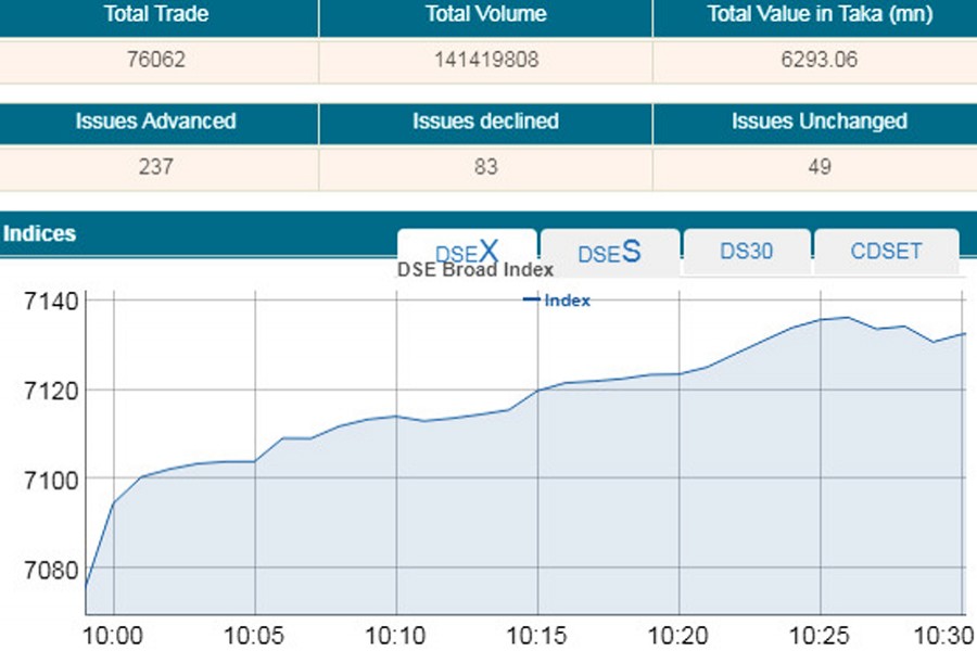 After crossing the prime index 7,000-mark, DSEX, the prime index of the Dhaka Stock Exchange (DSE), soared 58.12 points or 0.82 per cent to stand at 7,133 points within the first 30 minutes of trading at 10:30 am – the highest since its inception in 2013.