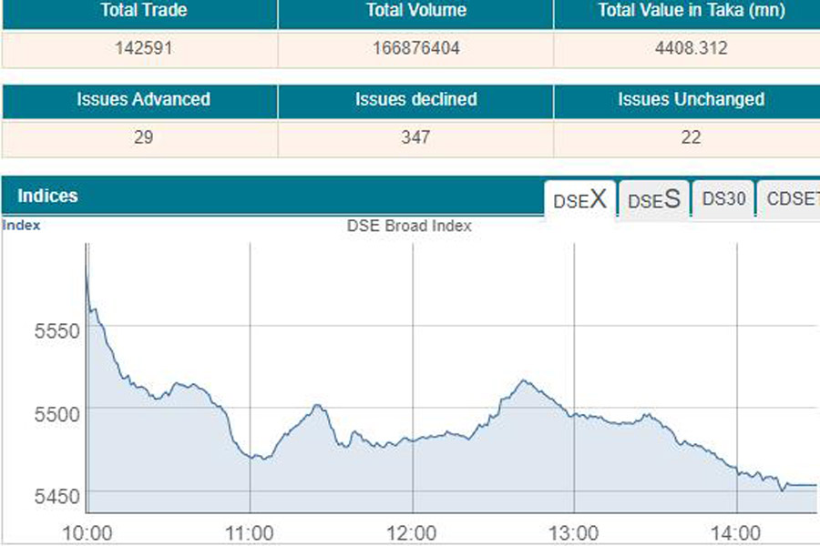 Finally, DSEX, the core index of the Dhaka Stock Exchange (DSE), tumbled more than 132 points or 2.37 per cent to settle at 5,454.