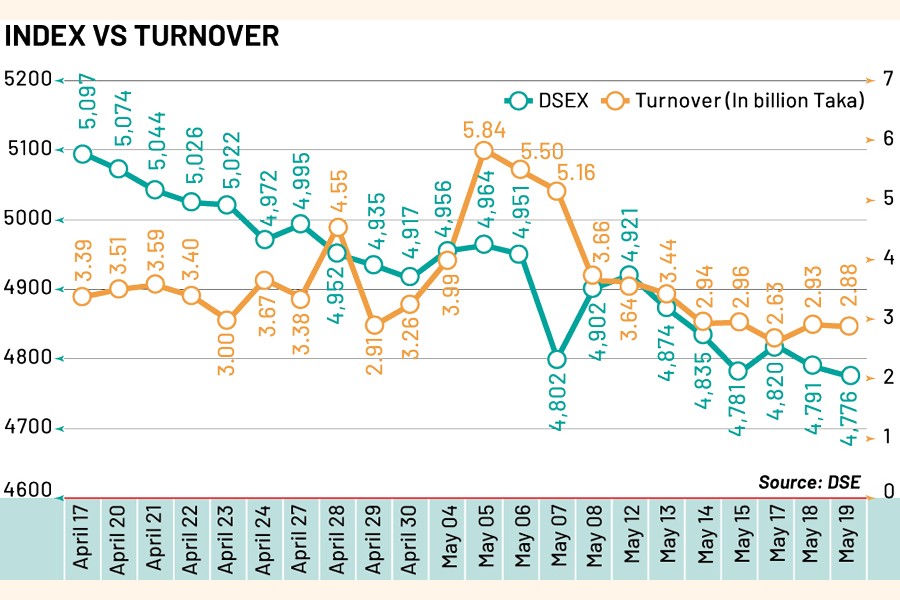 The benchmark index of the Dhaka bourse finally slid 15 points or 0.31 percent to 4,776, the lowest in nearly five years since August 2020, when the coronavirus pandemic played havoc on the economy.