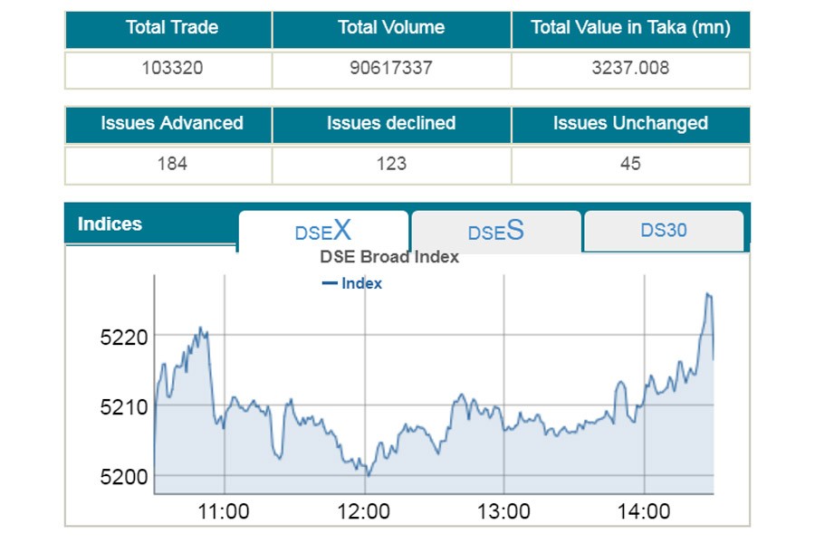 DSEX, the prime index of the Dhaka Stock Exchange (DSE), settled at 5,216, gaining 15.11 points or 0.29 per cent over the last session before Eid holidays.