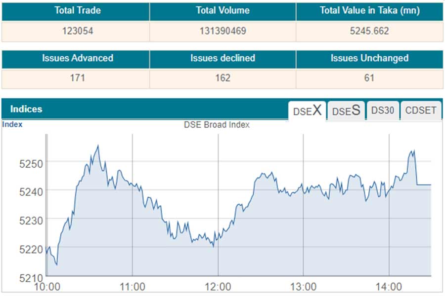 As a result, DSEX, the prime index of the Dhaka Stock Exchange (DSE), went up by 21.65 points or 0.41 per cent to 5,242, after losing more than 26 points in the previous day.