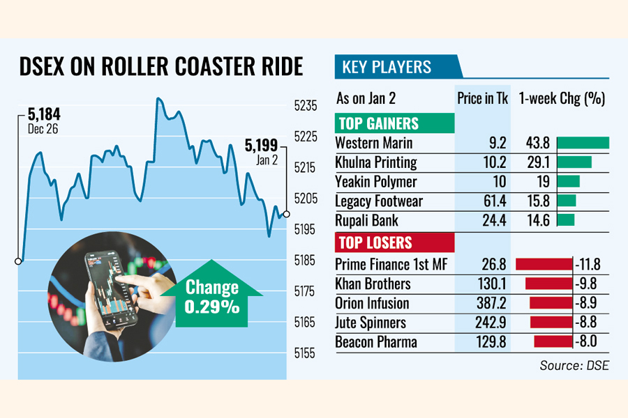 DSEX, the broad index of the Dhaka Stock Exchange, finally settle the week 15 points or 0.29 per cent higher at 5,199. This followed a 37-point decline the previous week.
