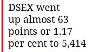 The benchmark index of the Dhaka Stock Exchange (DSE) went up almost 63 points or 1.17 per cent to 5,414, after suffering a decline by 134 points in the previous three trading days.