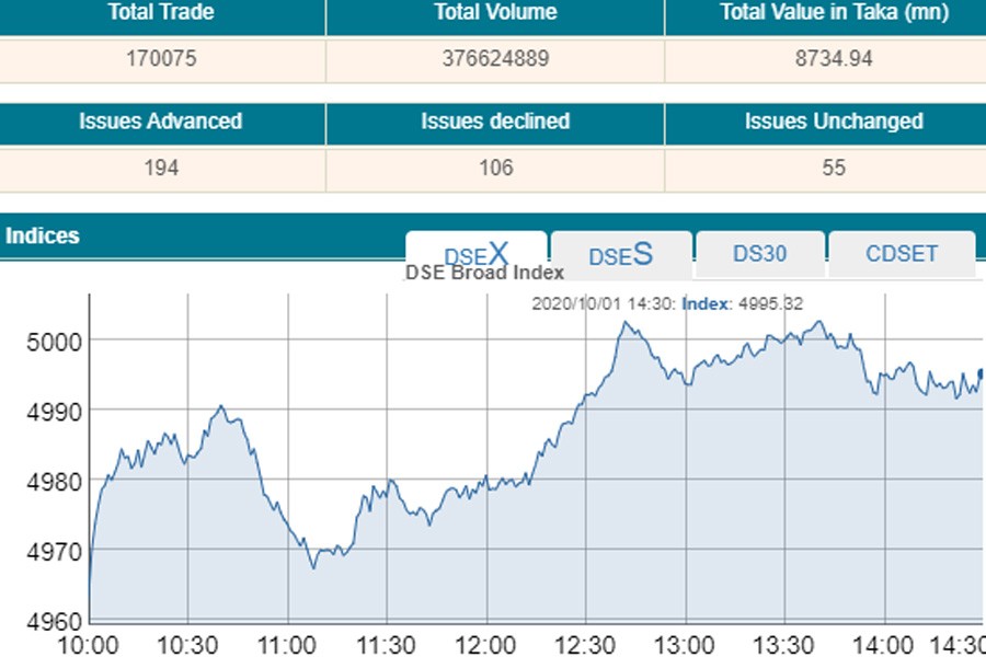 DSEX, the prime index of the Dhaka Stock Exchange (DSE), went up by 32.02 points or 0.64 per cent to settle at 4,995.