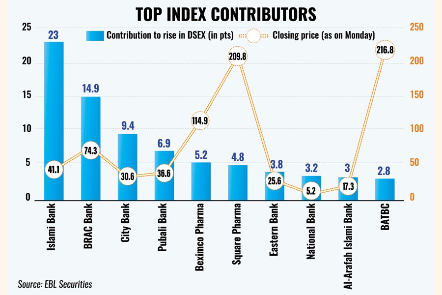 Price surge of blue-chip stocks, including Islami Bank, BRAC Bank, City Bank, Pubali Bank and Beximco Pharma, largely contributed to the market index rise. These five stocks accounted for a 59-point gain in the DSEX.