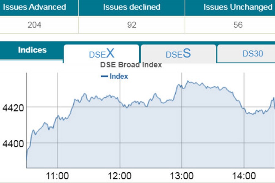 DSEX, the prime index of the Dhaka Stock, went up by 28.16 points or 0.64 per cent to settle at 4,418, after losing 66 points in the past four days.