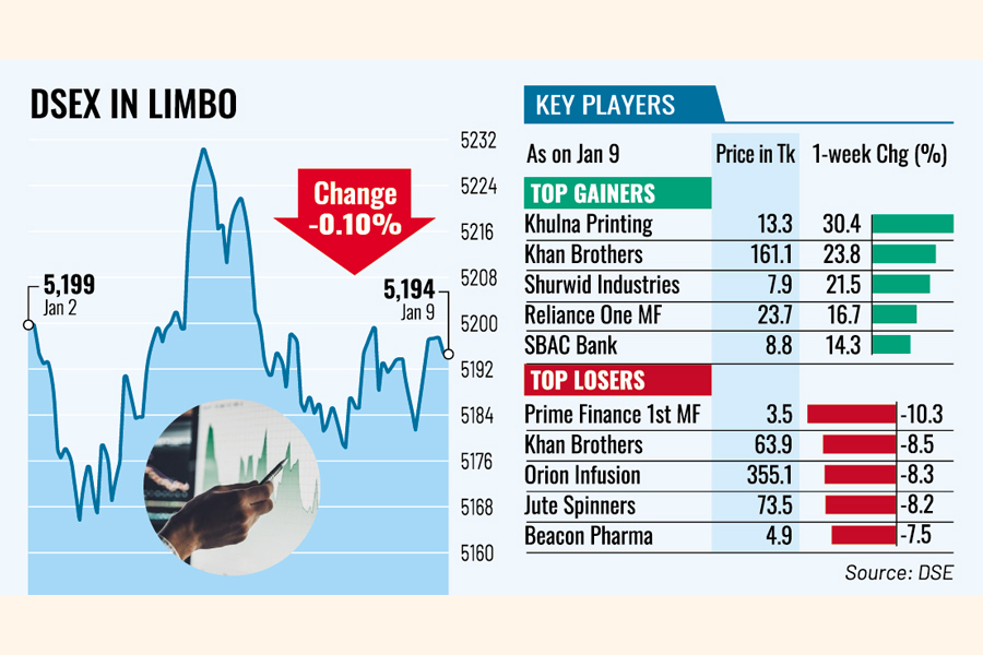 DSEX, the key index of the Dhaka Stock Exchange (DSE), finally settled the week 5 points or 0.10 per cent lower at 5,194. It gained 15 points in the week before.