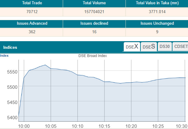 The market opened high, aided by the price appreciation of particular large-cap stocks, as opportunistic investors are expecting political stability and macroeconomic recovery following the peaceful election. The BNP-led alliance secured absoloute majority in the national election held on Thursday last. Following the BNP's landslide victory, investors hope for favourable market conditions ahead. As a result, the prime index of the Dhaka Stock Exchange (DSE), soared 115 points or 2.15 per cent to 5514 within the first 25 minutes of trading at 10:25 am, when the report was filed.