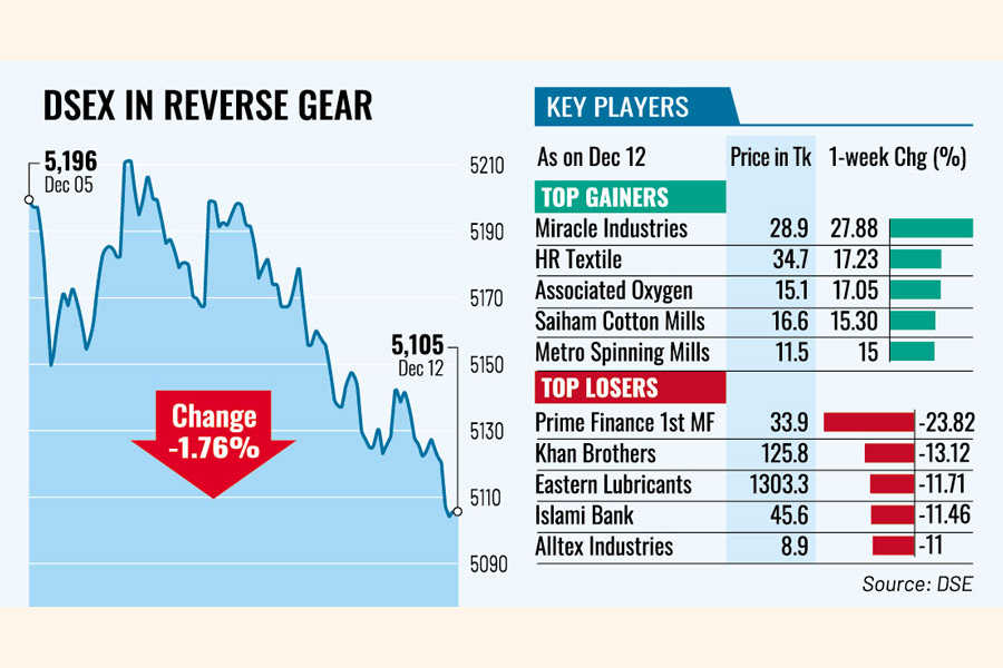 DSEX, the key index of the Dhaka Stock Exchange (DSE), finally settled the week 91 points or 1.76 per cent lower at 5,105, after gaining just 4 points in the week before.