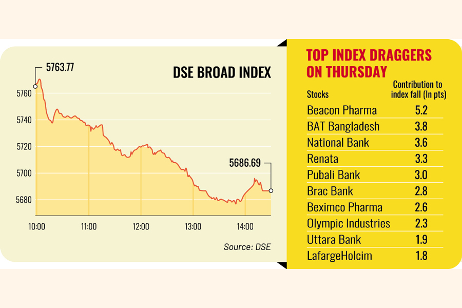 Beacon Pharma, BAT Bangladesh, National Bank, Renata, and Pubali Bank suffered the biggest losses and contributed largely to Thursday's market plunge. They jointly accounted for one-fourth of the day's index decline.